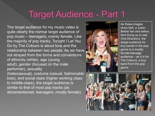 The target audience for most pop music, including the song in this music video, is teenagers, mainly female. The document discusses using forms and conventions from pop music, like ethnicity, age, gender, and social class, to target this same audience. It also discusses how the target audience is influenced by mainstream media like soap operas and is passive in how media affects their behaviors and views. Overall, the document is analyzing the target demographic for a pop music video and how to appeal to that audience.