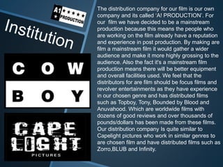 Our film distribution company is called 'A! PRODUCTION'. We have chosen to make our film a mainstream production to attract a wider audience and utilize experienced post-production staff and better equipment. We feel our film's distributors should be Focus Films and Revolver Entertainments as they have experience with our genre and have distributed similar successful London-based films. Our distribution company will specialize in independently made urban films based in London that may portray gangs and criminals.