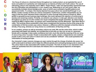 The document discusses various creative and technical elements used in a media production project focusing on themes of urban and youth culture. Colour, clothing, lighting, location, and camera angles are analyzed in terms of how they represent the themes and influence the audience. Vibrant colours, branded clothing, natural lighting, shots in Camden Market and the London Underground, and extreme close-ups are used to depict modern urban society and engage viewers. Inspiration is drawn from music videos by MIA, Rihanna, Taylor Swift, and Jay-Z to achieve a realistic portrayal that reflects the lyrics and immerses the audience.