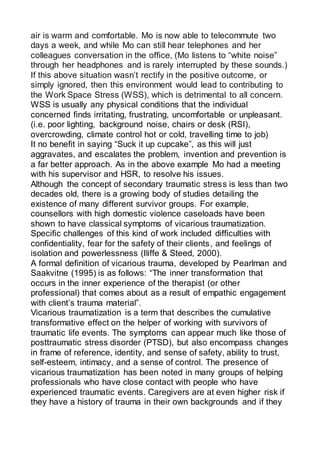 The document emphasizes the importance of workplace housekeeping in counseling and community services, highlighting how negligence can lead to accidents, stress, and adverse health outcomes. It discusses the impact of environmental factors on worker well-being and the necessity of addressing issues such as workspace ergonomics and stress management. Additionally, it presents the concept of vicarious trauma in caregivers and stresses the interconnectedness of self-care, advocating for comprehensive WHS policies in the field.