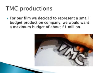 The document discusses a fictional low-budget film production company called TMC that is making a horror film on a budget of £1 million. It discusses how successful horror films like The Blair Witch Project and Paranormal Activity were made on tiny budgets in the tens of thousands yet became hugely profitable franchises. These examples inspired the company to pursue a low-budget model. The company will use unknown actors and distribution by UK company Film 4 Productions, which has experience with both low and medium-budget films.