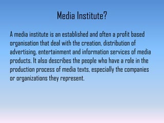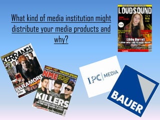 IPC Media would be the best media institution to distribute my alternative/rock magazine. IPC Media publishes over 60 media brands across multiple platforms, reaching over 25 million users globally each month. While Bauer Media also publishes magazines, IPC Media would have less competition as it only publishes one similar indie/rock magazine, NME, as opposed to Bauer's more successful music magazines. IPC Media also engages with audiences that align with my magazine's mixed gender content, reaching two-thirds of its 26 million UK users who are women and over 40% who are men.
