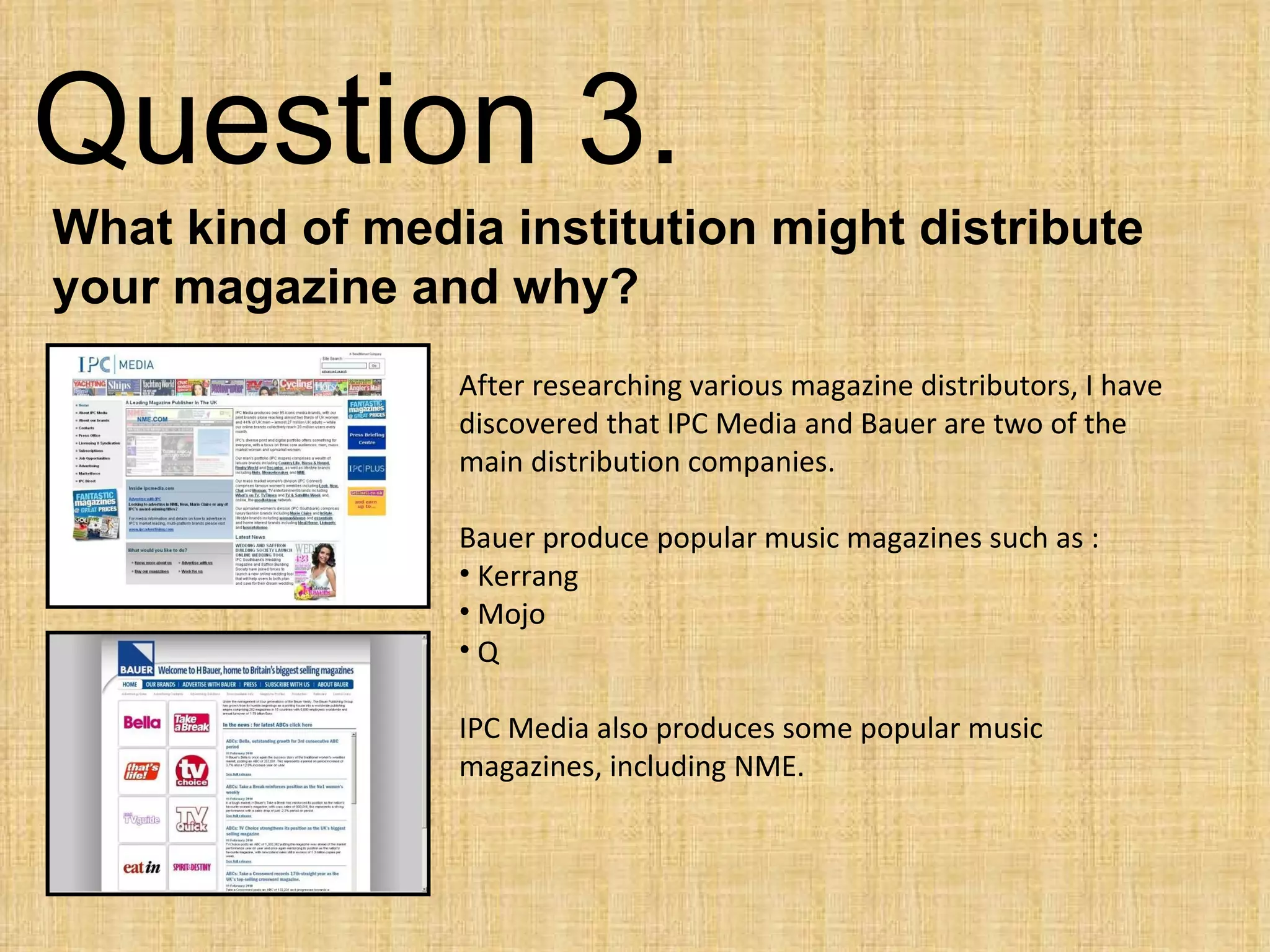 The document discusses magazine distribution options. It analyzes that mainstream distributors like Bauer and IPC Media, which distribute popular music magazines like NME and Kerrang, may be suitable because they can reach a wide audience to earn back the high distribution costs. Independent distributors have smaller scale and can target niche audiences, but the magazine aims to appeal widely. Mainstream distribution provides high consumption but also high costs, while independent is lower profile but risks low sales. Multi-platform consumption through internet, radio and TV like NME could also be used to increase brand popularity and sales.