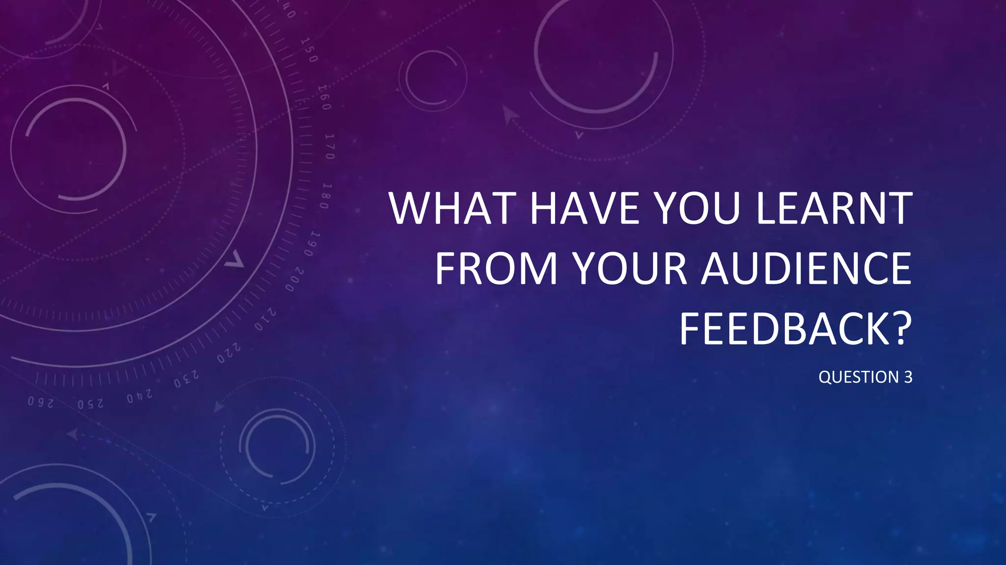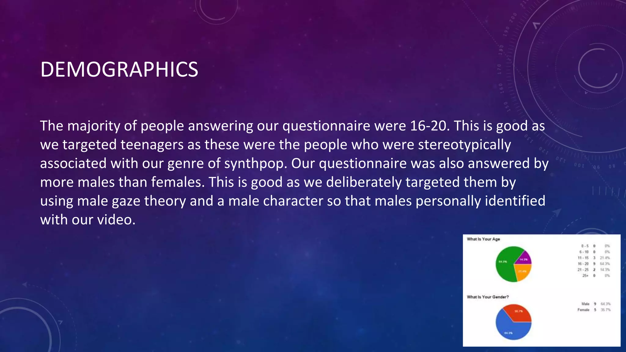 The document discusses feedback received from focus groups on a synthpop music video. It provides details from questionnaires on the demographics of respondents and their likes/dislikes about different elements of the video. The focus groups felt the ending was unprofessional and the camerawork could be improved. Based on the feedback, the ending was changed and image stabilization was added. Questions were asked about potential additions like lip syncing, more characters, or artist footage. The feedback was mixed, so only lip syncing was added. There was uncertainty around the narrative but adding a vignette helped clarify it. The feedback helped make targeted improvements to appeal more to the intended audience.