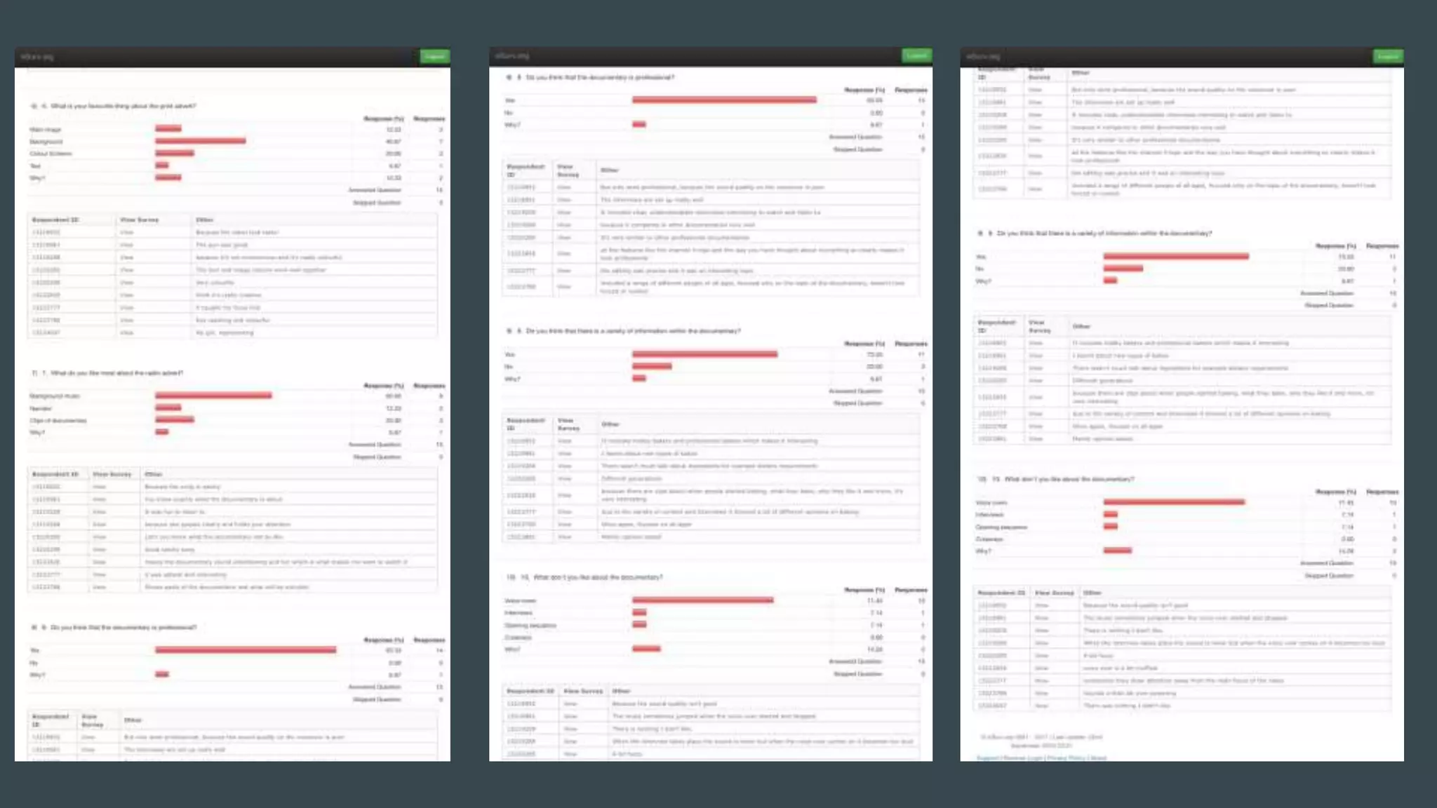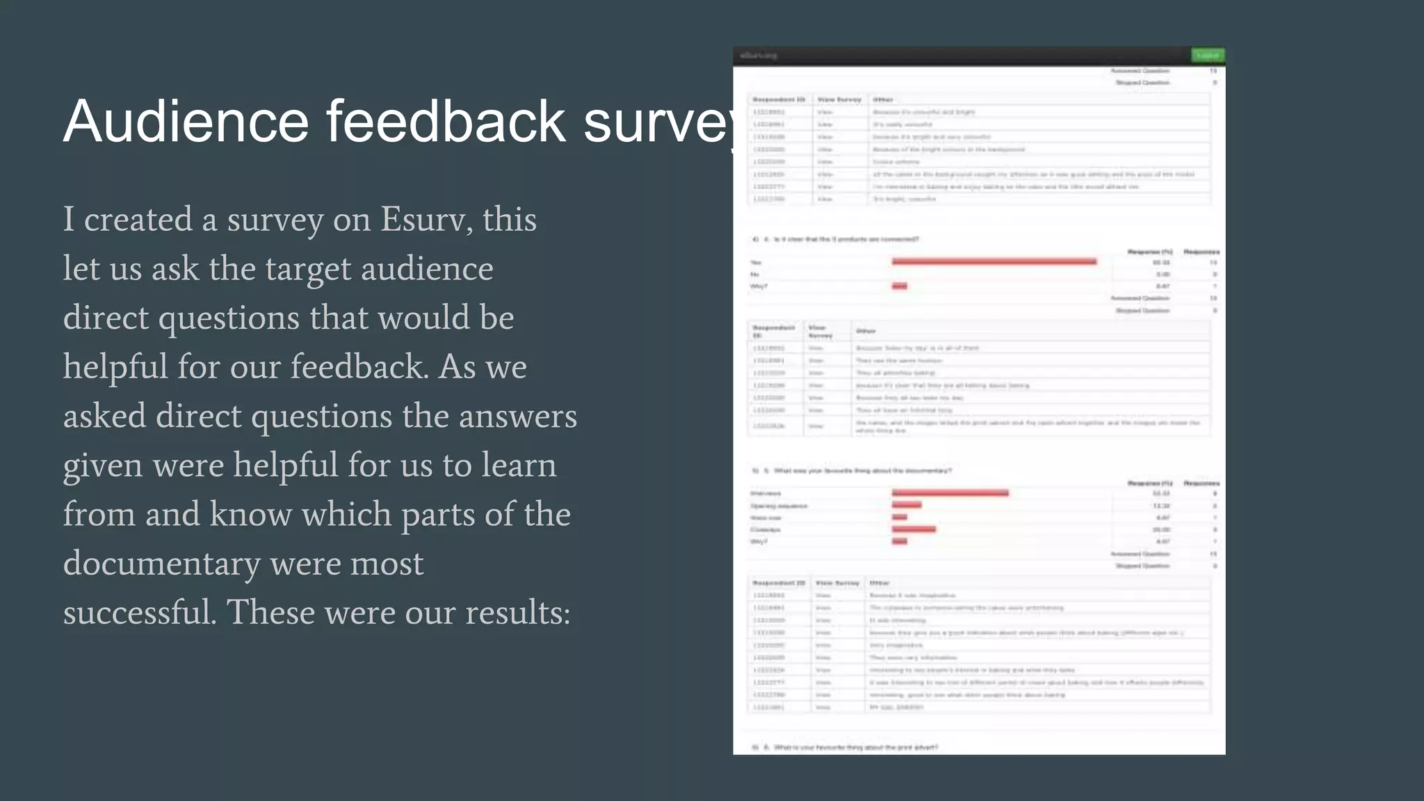 The document summarizes feedback received from audience surveys, video interviews, social media comments, and a documentary review on a documentary project. The surveys showed that 100% of respondents thought the documentary effectively showed the relationship between the 3 related products. However, 83% said the voiceover was the weakest part. Social media feedback praised the upbeat music. Going forward, the creator learned that their multi-product approach can be effective, but needs to improve voiceover quality.
