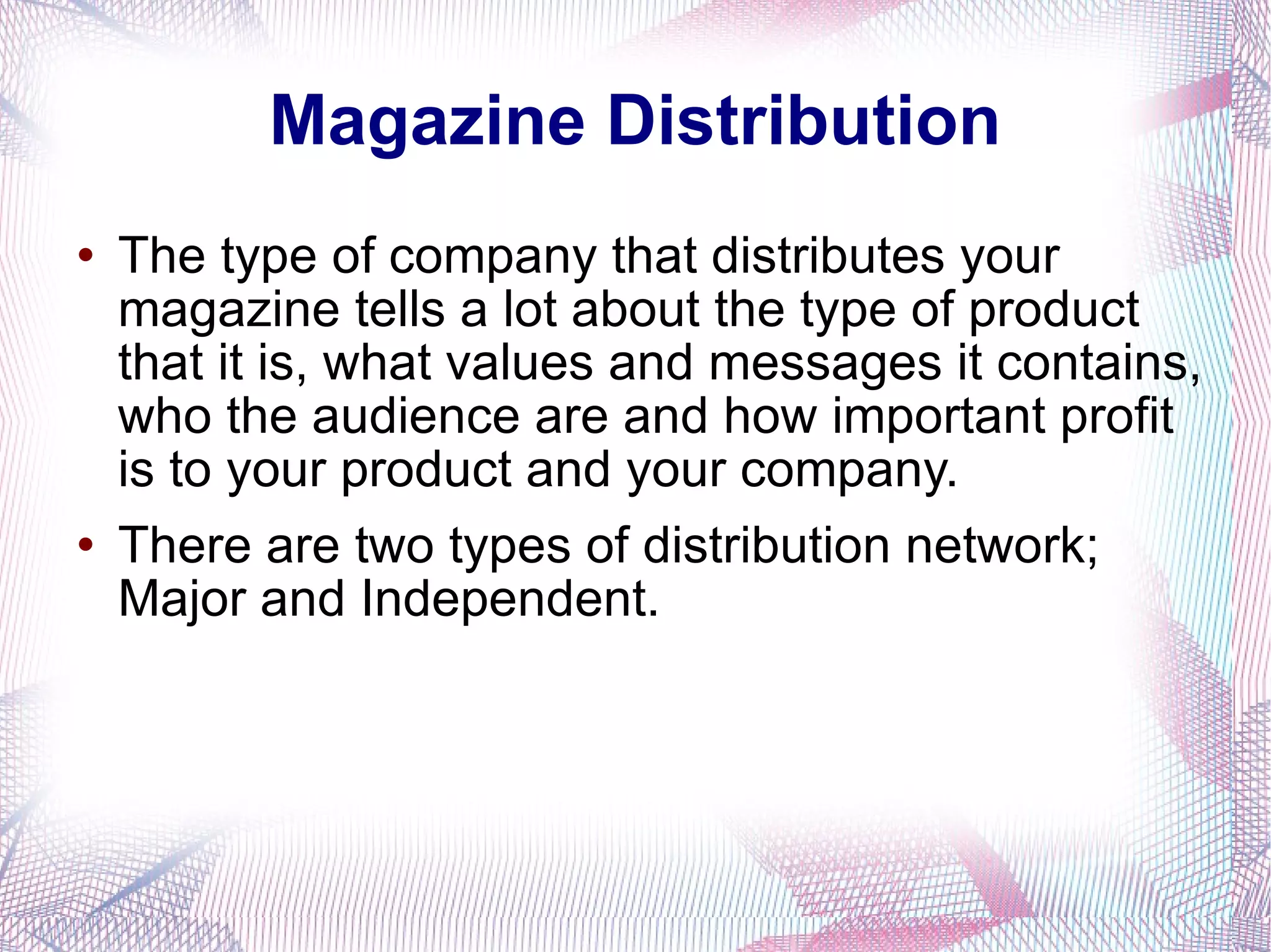 The document discusses magazine distribution strategies and provides examples of major and independent distributors. Major distributors like Frontline aim to saturate markets and maximize profits by distributing large numbers of magazines to major retailers. They distribute over 160 titles weekly to over 55,000 shops. Independent distributors like Vice focus more on niche audiences and individuality over profits, distributing primarily online and to select stores. The author concludes they will use a major distributor like Frontline to distribute their proposed rock/indie magazine, to reach a wider audience across multiple platforms and charge more for advertising.
