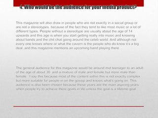 This document contains two audience quotes about a magazine. The first quote says the magazine stands out from others due to its colorful front cover, which caught their attention despite not usually reading magazines. The second quote notes the magazine looks professional, but thinks the colors are too extravagant, though it makes the magazine more visible.