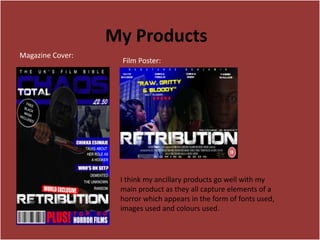 The document discusses how the author's main film product and two ancillary texts - a magazine cover and film poster - work well together to promote and summarize the film. All three products use similar design elements like fonts, images, and colors seen in the film trailer to create cohesion and reference the horror genre. The magazine cover features the villain and knife from the trailer, while the poster includes snippets of footage also in the trailer to entice viewers and show the relationships between the products. Together the three pieces are meant to work together vertically to advertise and drive audiences to watch the film.