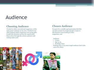 The target audience for the magazine is middle-aged working class individuals ages 15-35. The magazine aims to appeal to this demographic based on an analysis of similar magazines' styles, colors, and writing levels. While working class readers are the primary target, the content also aims to attract a wider readership that is unisex and spans ages 15 to 35.