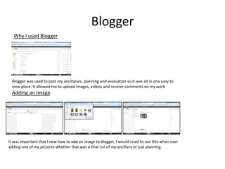 Blogger, Twitter, YouTube, SlideShare, PowerPoint, Publisher, and Photoshop were used for various aspects of creating and sharing media for a project on scripted reality TV shows. Blogger allowed posting work and receiving comments. Twitter enabled contact with teachers for assistance. YouTube and SlideShare helped upload videos and presentations. PowerPoint created evaluation slideshows. Publisher assisted with notes. Photoshop edited photos, created covers and posters, and allowed font and background changes.