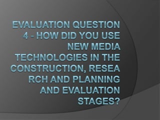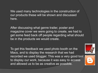 This document discusses the various technologies used to create a film trailer, magazine cover, and poster for a class project. Students used Macs with Final Cut software to edit footage from camcorders and create the trailer. They created storyboards on paper then scanned them and shared online. Feedback was gathered through photo booth and displayed on blogs. Copyright-free music from websites was added to the trailer in Final Cut. A camera captured photos for the magazine cover and poster. The finished works were shared on YouTube and blogs.