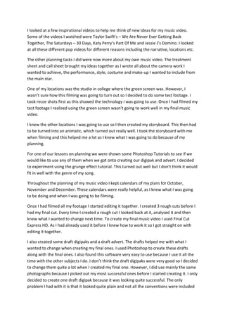 The document discusses the planning and research stages of creating a music video. It describes analyzing existing music videos to help plan shots, narrative, and style. Extensive planning tasks are outlined, including creating logos, storyboards, calendars, test footage, and draft packaging. Various software like Photoshop and Final Cut were used to design elements and edit the final video. Throughout production, rough cuts and drafts were made and reviewed iteratively to improve the end product.
