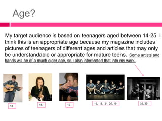 My target audience is teenagers aged 14-25 who enjoy rock, acoustic, alternative, and punk music genres. Specifically, fans of bands like Biffy Clyro, Weezer, Coldplay, Green Day, Blink 182, Sum 41, The Script, and All Time Low would be the intended readers. The magazine is meant to appeal to both male and female teenagers, featuring pictures and articles relevant to both boys and girls. While certain musical styles are typically associated with various stereotypes, the magazine is open to all readers regardless of how they dress, look, or identify.