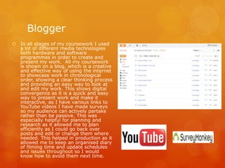 The document discusses the various media technologies used at different stages of coursework, including a blog to showcase work chronologically, YouTube videos, and surveys to get audience feedback. Final Cut Express was used to edit videos professionally with filters, splits screens, and transitions. Different cameras like Sony HD, Kodak, and Nikon SLR were used for their image quality and focus capabilities. Photoshop and Illustrator were used to edit images, add effects, separate sections, change colors, and add text for creating media texts like a digipak and advert.