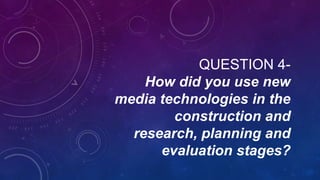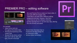 The document discusses the use of various new media technologies in the production of a music video. Premier Pro was used to edit video clips, including adding fades, cuts, resizing clips, and altering speed and color. Photoshop allowed editing of photos, including removing text and applying filters to create overlays. YouTube provided inspiration from other artists' videos and was used to upload and share the finished video. Blogger served as a platform to publish work online, including research, planning, and embedded videos.