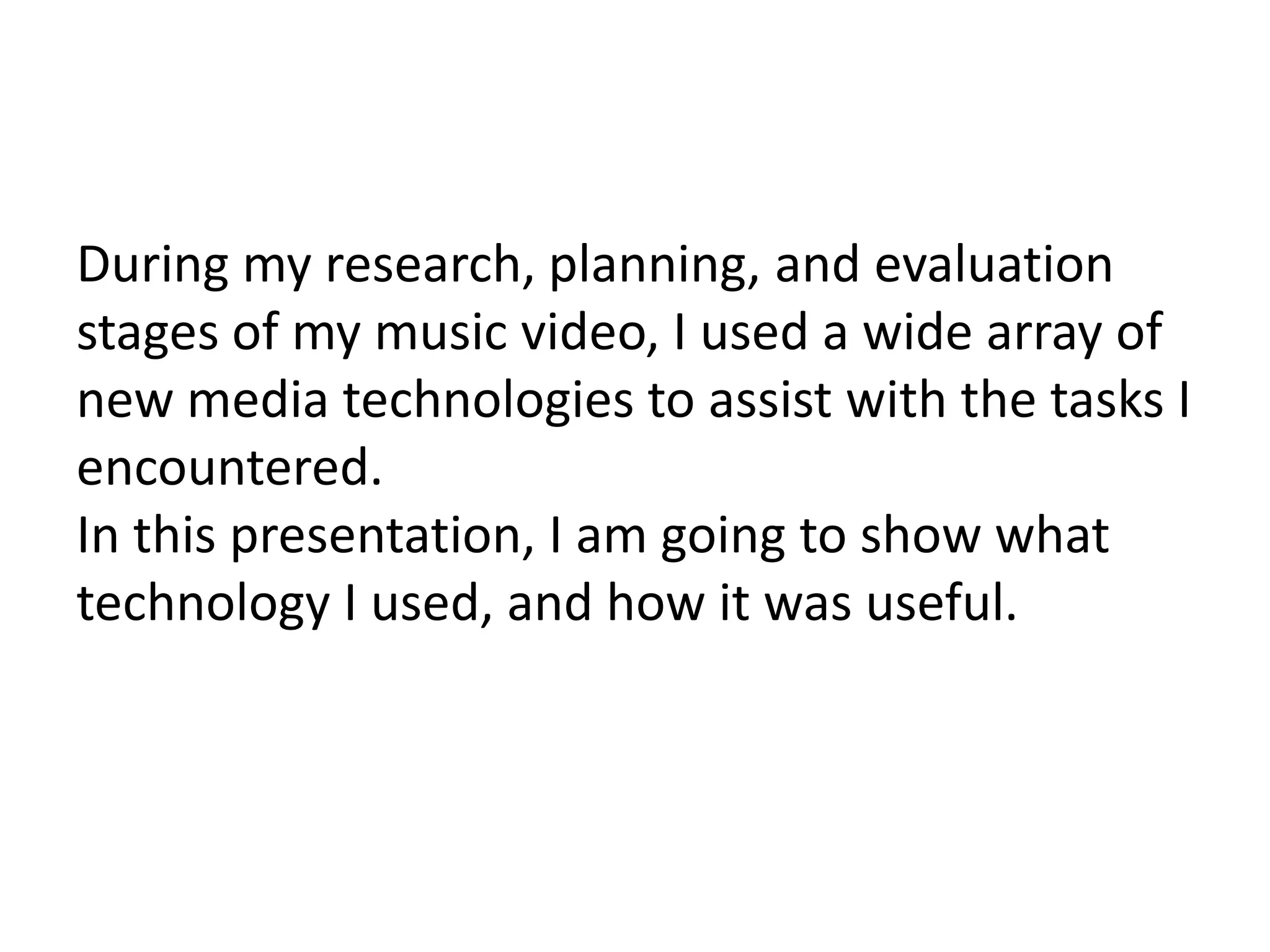The student used a variety of media technologies throughout the research, planning, construction and evaluation of their music video project. A smartphone was used to record ideas and storyboards via a blogging app. Footage was captured using a Panasonic camcorder from the college and a FujiFilm camera when the camcorder was unavailable. A Nikon DSLR was used for stop motion animation and still photography. Adobe Photoshop and Premier Pro were utilized for image editing, mood boarding, and video editing. Social networks like Facebook and blogs supported communication, project documentation, and audience feedback. While most technologies proved useful, opportunities remained to further leverage the creative capabilities of the camera, software and social platforms.