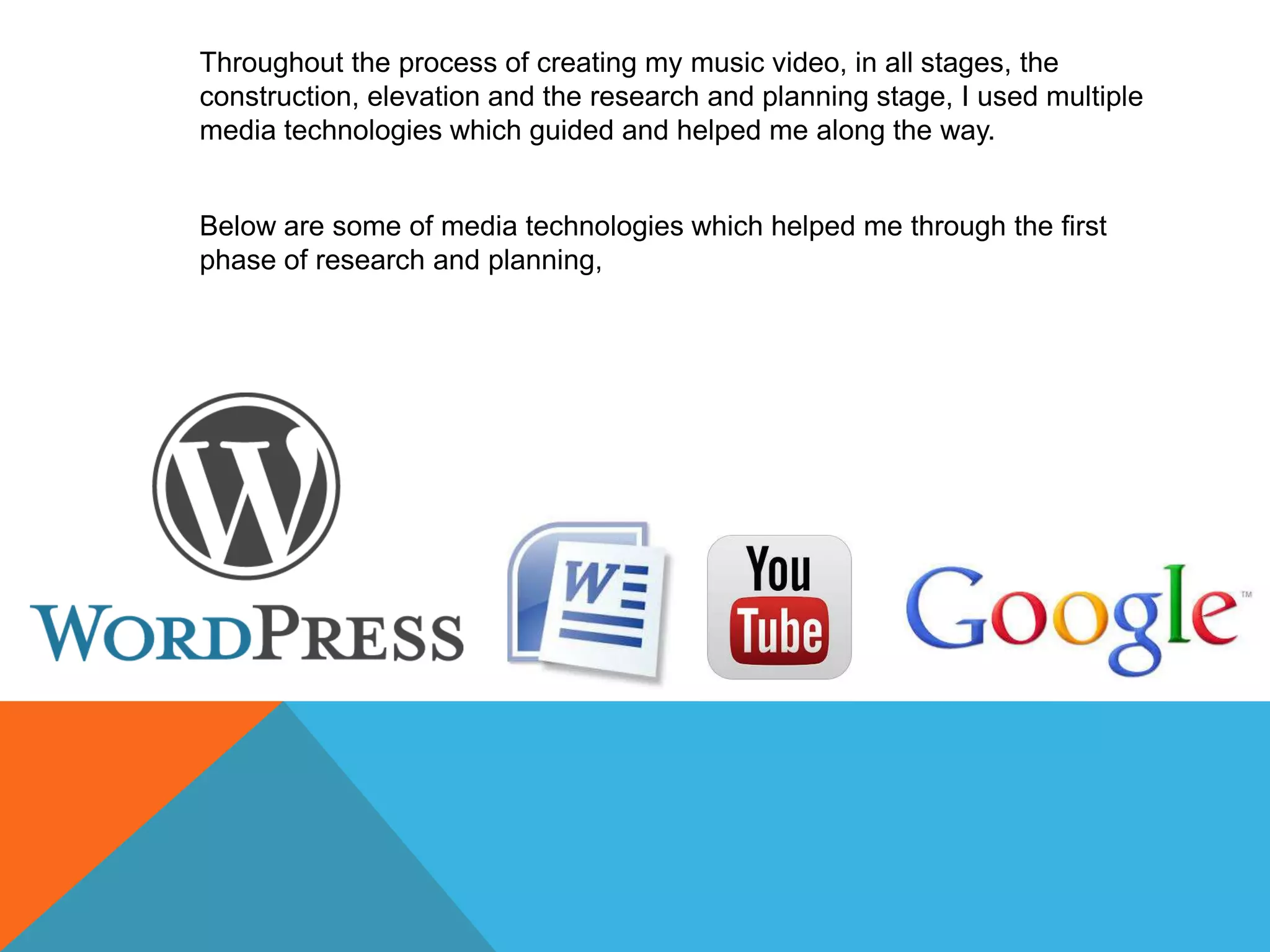 The student created a music video and used various media technologies throughout the process. In the planning stage, they used WordPress to blog research, YouTube to find reference videos, Google to research topics, and social media to identify the target audience. During construction, they shot footage with a camera and tripod, then edited in Photoshop and iMovie, adding effects and sound. For evaluation, the student again used WordPress to blog reflections and present findings with Slideshare and Prezi, then shared the final video on YouTube to gather feedback.