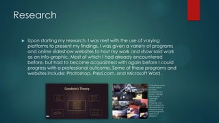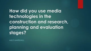 The student used various media technologies at different stages of their project. In the research stage, they used Photoshop, Prezi, and Microsoft Word to analyze images, present findings, and write long-form responses. For pre-production, they created an animatic using Sony Vegas and survey using SurveyMonkey. In production, they made a music video with After Effects, 3D object for a poster with Cinema 4D, and digipak with Photoshop. The student was most familiar with After Effects, Photoshop, and Word which aided their work, while they had to learn to use drives and backup files effectively over the course of the project.