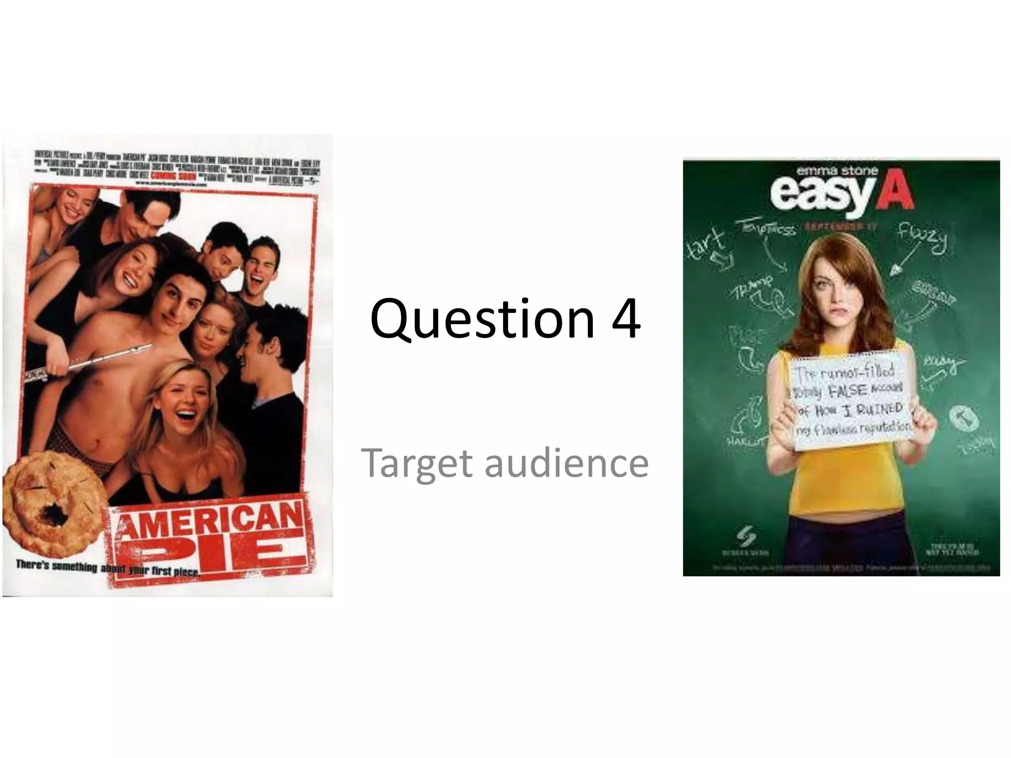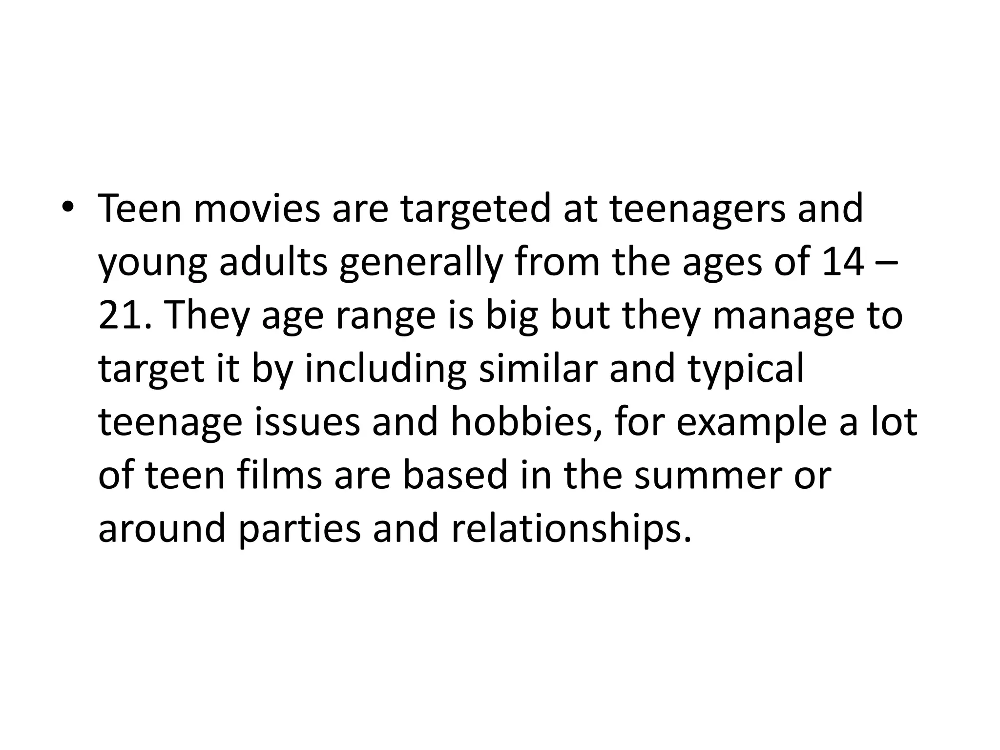 This document discusses the target audience of a teen film with supernatural elements. It notes that teen movies generally target ages 14-21 by including typical teenage issues like parties and relationships. The discussed film's subgenre of supernatural would attract teens interested in properties like Twilight, as the main character is a vampire hiding his identity. The specific target audience is described as teenagers aged 15-19 interested in supernatural films who can relate to keeping a secret from friends out of fear of not being accepted, and also enjoy elements of action, romance, and supernatural themes.