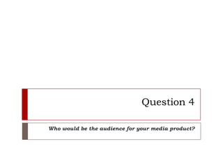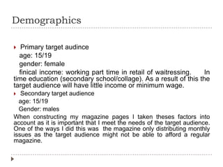 The target audience for the media product are males and females aged 15-19. The primary target audience would have part time jobs with low incomes. They enjoy spending time with friends, following trends, shopping at stores like Topshop, and listening to niche music genres. A focus group on social media provided feedback on the magazine's look to help meet the needs and interests of the target audience.
