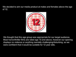 The document discusses the target audience for a media product. It was decided the target audience would be males and females above age 12. Research was conducted on the BBFC website to determine what type of footage would be appropriate for this age group for the horror/thriller genre. A survey was also conducted of people ages 12 and older to learn what they want to see in a horror/thriller film. Elements like suspense, scary music, dark lighting, an evil character, and plot twists were incorporated based on the research and survey responses.