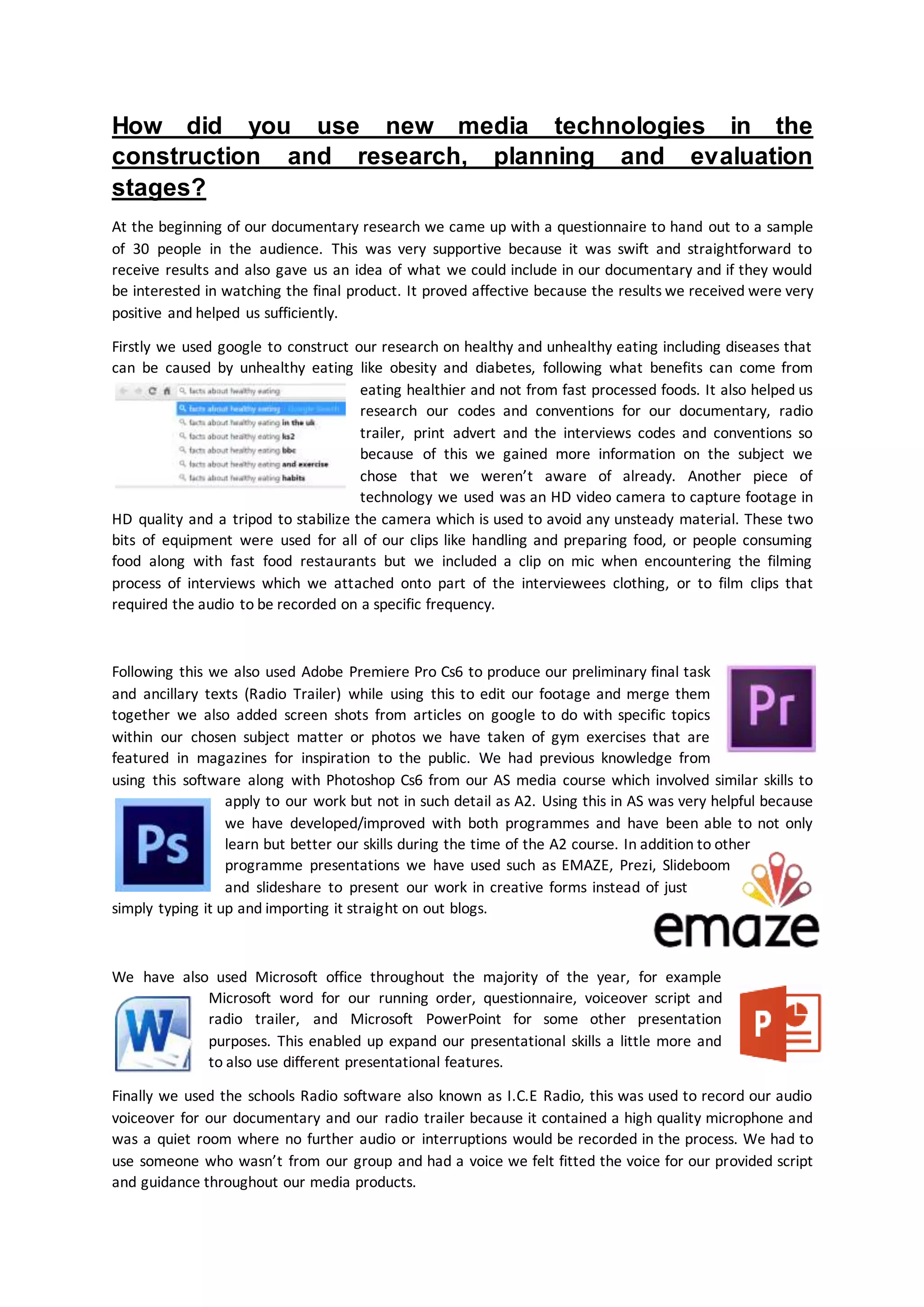 The student used various new media technologies throughout the planning, research, and evaluation stages of their documentary project. They began by creating an online questionnaire to gather audience feedback, which provided useful insights. Google was used for initial research on their topic of healthy and unhealthy eating. An HD video camera, tripod, and clip-on microphone were used to capture high quality footage and audio for interviews. Adobe Premiere Pro was used to edit the footage and add additional elements like screenshots. Microsoft Office applications like Word and PowerPoint were utilized for planning documents and presentations. Finally, the school's audio software was used to record voiceovers for the documentary and radio trailer.