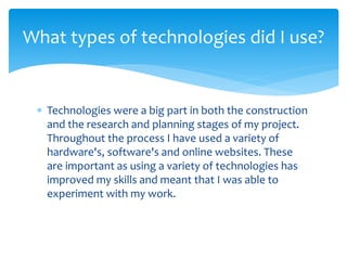 The student used various media technologies in the construction, research, and planning stages of their project. They used a Nikon D3200 camera, Apple iMac computer, Photoshop, and Premier Pro software to film footage, edit videos, and design posters, logos, and packaging. They also utilized online platforms like YouTube, Vimeo, and Blogger to upload, host, and document their work. These technologies improved their skills and allowed experimentation.