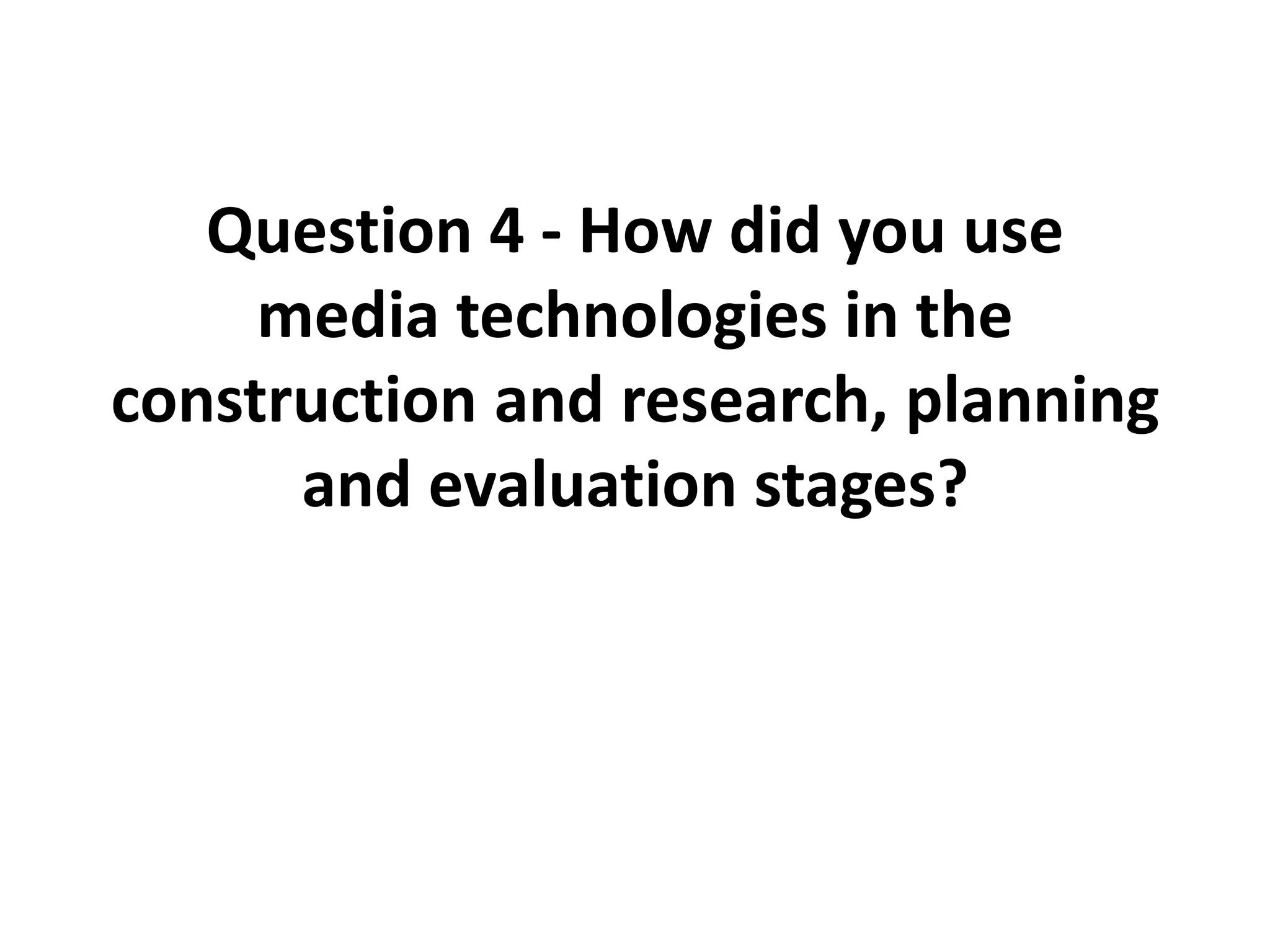 The document discusses the various media technologies used at different stages of a music video project. It describes using Panasonic DV and HD cameras to film footage, a Nikon DSLR camera to take photographs, and Adobe Photoshop, Premiere Pro, and OnLocation software to edit photos, videos, and import footage. Blogger was used to document the project online. A Blackberry was also used to upload storyboard ideas directly to the internet. New media like YouTube and Facebook allowed for audience feedback.