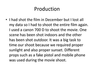 The filmmaker used Adobe Premiere Pro 2015 to edit the film. This software includes tools like cut and dissolve that were used, as well as effects to cover any mistakes made during shooting. The film had to be re-shot entirely after losing the original data. Shooting took place both indoors and outdoors using a Canon 700D, with props such as a fake pistol and phone. Social media like Facebook was used to promote and market the film by creating a page and sending friends a link to watch it on YouTube and Vimeo.