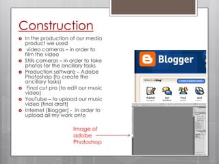 ConstructionIn the productionof our media product we used video cameras – in order to film the videoStills cameras – in order to take photos for the ancillary tasksProduction software – Adobe Photoshop (to create the ancillary tasks) Final cut pro (to edit our music video)YouTube – to upload our music video (final draft)Internet (Blogger) - in order to upload all my work ontoImage of adobe Photoshop
