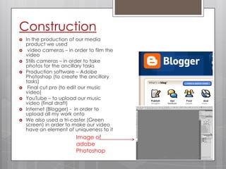 New media technologies were used throughout the construction, research, planning, and evaluation stages of creating a music video. Video and stills cameras were used to film and photograph footage and locations. Adobe Photoshop and Final Cut Pro were used to edit the video and create ancillary materials. YouTube and blogs hosted the uploaded video and research materials. Microsoft Word and PowerPoint aided in audience research and evaluation. Google provided inspiration and ideas for the ancillary product.