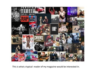 The document discusses the target audience for a proposed rap music magazine called "The Plug". The target audience would be 90% male and 10% female, consisting mainly of young adults interested in underground rap music. Readers would enjoy learning about new rap artists and songs, following their favorite rappers, and getting involved through music competitions featured in the magazine. The style and content of the magazine is aimed at rap fans seeking information on new albums, concerts, and the broader rap culture. A typical reader would be interested in rap music, street fashion, and the rapper lifestyle.