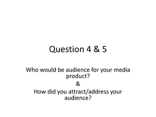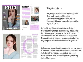 This document discusses how the author targeted and attracted their audience for a pop music magazine. Their target audience was males and females between 14-25 who are interested in pop music. To understand this audience's preferences, the author conducted a focus group. They also used reception theory to help the audience relate to the artists featured. Key tactics to attract the audience included using bright, bold designs on the cover and contents page to stand out. Pull quotes and exclusive stories were also used to entice readers. Social media links connected to the target demographic. Images and text on spreads directly addressed the audience to help them connect with artists.