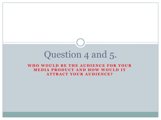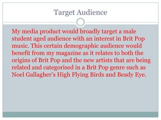 This document discusses the target audience and how to attract them for a media product focused on Brit Pop music. The target audience is male students aged 18-20 with an interest in Brit Pop music and local bands. The ideal reader is described as liking this type of music, socializing with friends, going to pubs and local music venues. The product would attract this audience through its cover featuring an attractive model, bold red and white design that stands out, cover lines about Gallagher's and new acts, and a stereotypical MOD tag line.