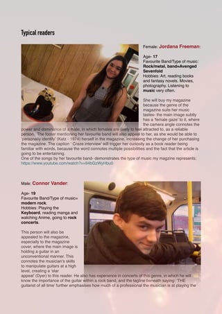 The document discusses targeting a magazine's audience of teens and young adults aged 15-25 who enjoy rock music genres like Green Day and Foo Fighters. It describes the audience as generally working class students or early adults with limited disposable incomes. Two typical readers are profiled - 17-year-old Jordana who enjoys rock and metal music, and 19-year-old Connor who plays keyboard and attends rock concerts. The magazine aims to inform, entertain, and provide diversion or escapism for its audience through articles on musicians and vibrant visual design.