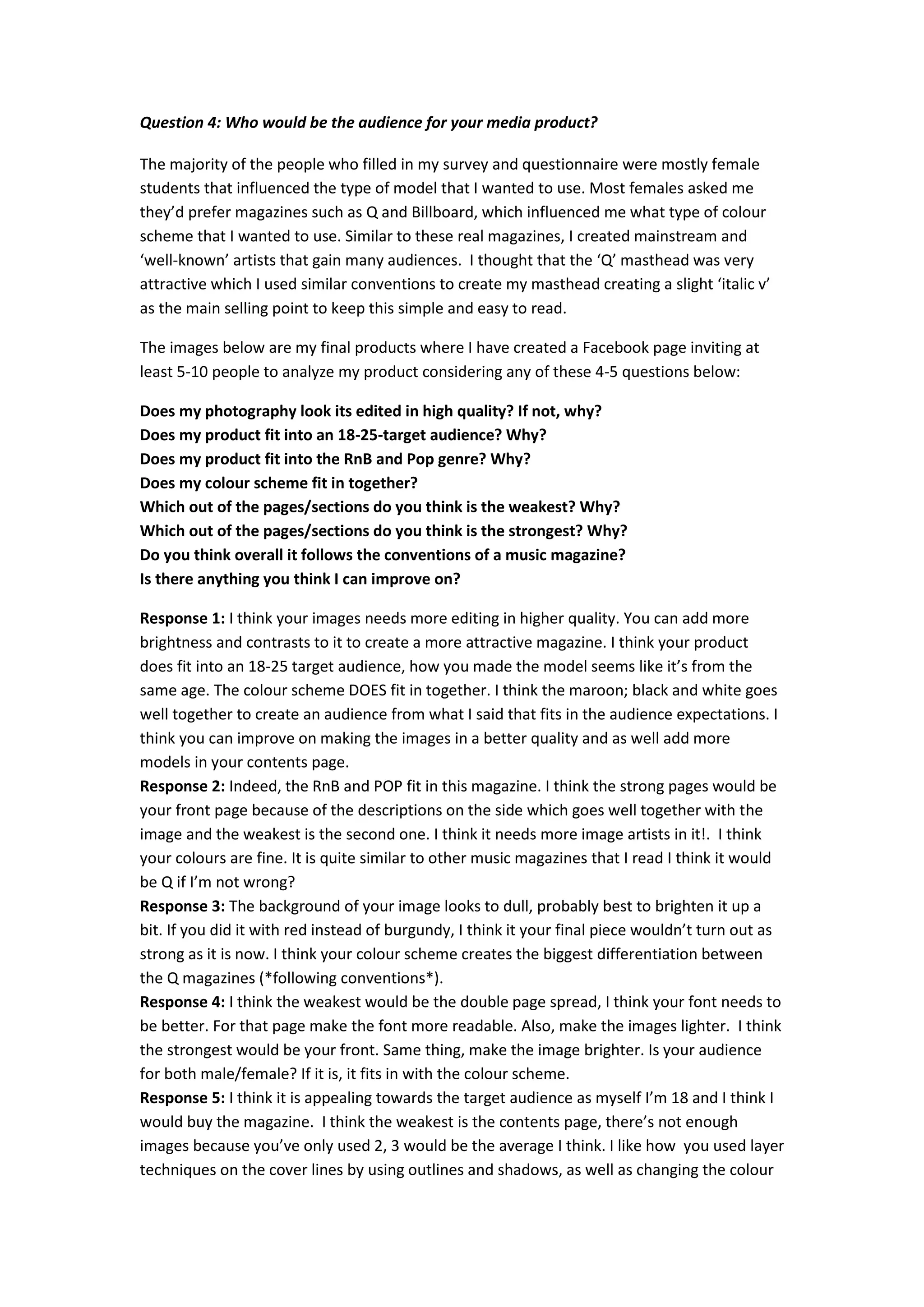 The majority of responses to the survey about the media product provided feedback on how to improve the images through higher quality editing in Photoshop to brighten and increase contrast. While most agreed the content and color scheme fit the target 18-25 audience and genre of R&B and pop music, some noted specific weaknesses like the contents page needing more images or stronger layout. Overall, the responses evaluated how well the product followed music magazine conventions while providing suggestions to strengthen the images.