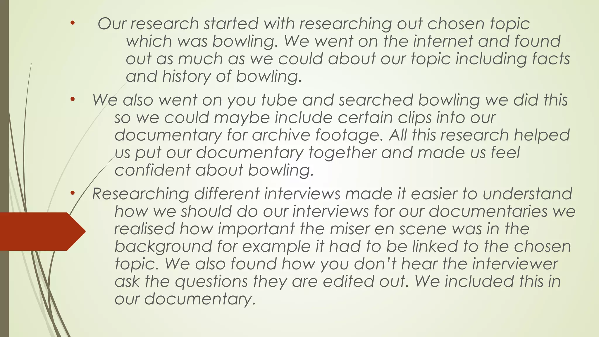 The document discusses the research and planning, construction, and tools used to create a documentary, print advertisement, and radio trailer on the topic of bowling. Planning involved researching bowling online and on YouTube, as well as researching interviews to understand film techniques. Word was used to plan scripts, proposals, and questionnaires. Premier Pro and Photoshop were the main software used to edit video and design graphics. Filming equipment like HD cameras, microphones, and tripods were needed to capture high quality footage. Blogger and other online platforms were used to organize work and present final products, while the internet provided crucial research resources.