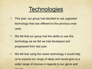 The document summarizes the new media technologies used by the group at different stages of their project. In the construction and research planning stages, they used Macs, iPads, blogs, an HD camera, DSLRs, PicMonkey, social media, YouTube, and Google. During production, they used iMovie to edit videos. For evaluation, they used Prezi, Slideshare, Wix, and microphones. The group felt these technologies helped expand their ideas, were easy to use due to familiarity, and supported efficient collaboration and presentation of their work.