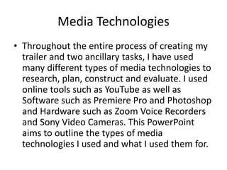 The document outlines the various media technologies used by Rhiannon Jenkins throughout the research, planning, construction, and evaluation stages of creating a trailer and two ancillary tasks. These include hardware such as cameras, voice recorders, and computers, as well as software like Photoshop, Premiere Pro, PowerPoint, and online tools such as YouTube, Blogger, and SurveyMonkey. Each technology is described in the context of how it was used at different stages of the project.