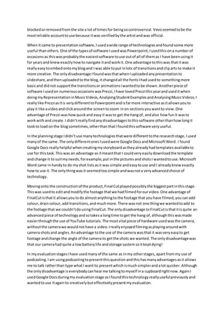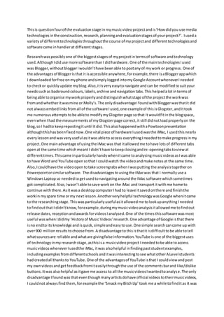I used a variety of technologies throughout my music video project, with different ones being useful at different stages. During research, I relied heavily on online tools like Blogger, Google, and YouTube to organize my work, find information, and access music videos. I also used the iMac computer in class to have multiple resources open simultaneously while analyzing videos. In planning and construction, I used software like Google Docs, Final Cut, and Microsoft Word. I filmed footage with a camera and edited it using Final Cut. Now in evaluation, I am using podcasting to present my reflections and Google Docs to create an effective evaluation.