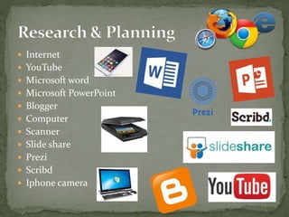 The document discusses the various technologies used during the planning, production, and evaluation of a music video project. It describes using the internet for research, YouTube to analyze other music videos, Microsoft Word and PowerPoint for planning tables and presentations, and Blogger to upload work and receive feedback. Video and photo equipment were used to film footage and conduct a photoshoot. Adobe Premiere and Photoshop were used to edit the video and create promotional materials. Different media were employed to structure the evaluation, including Slideshare, Prezi, and receiving feedback.