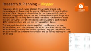 The document discusses the various media technologies used by the author at different stages of creating a music video project. In the planning stage, the author used Blogger to document research and share views, and also used tools like Canva, Instagram, SlideShare and Prezi to create posters and presentations. In the construction stage, an iPhone 8 camera was used for filming due to its high quality, and Final Cut Pro was used for editing due to features like the magnetic timeline. Photoshop was also used to edit photos for the digipak and poster. Overall, the use of different technologies helped improve the professionalism and appeal of the author's work.