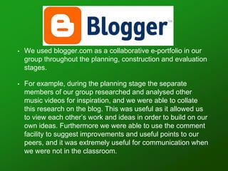 This document summarizes the use of various digital tools throughout the planning, production, and evaluation stages of a group music video project. Blogger was used as a collaborative workspace to share research, ideas, schedules, and for communication. Survey Monkey was used to create and distribute an audience questionnaire. Adobe Premiere Pro was used for video editing and linking clips to music. Adobe Photoshop was used for image editing and design work. After Effects was used for color grading video. A DSLR camera was used for photography and videography to enable various creative techniques.