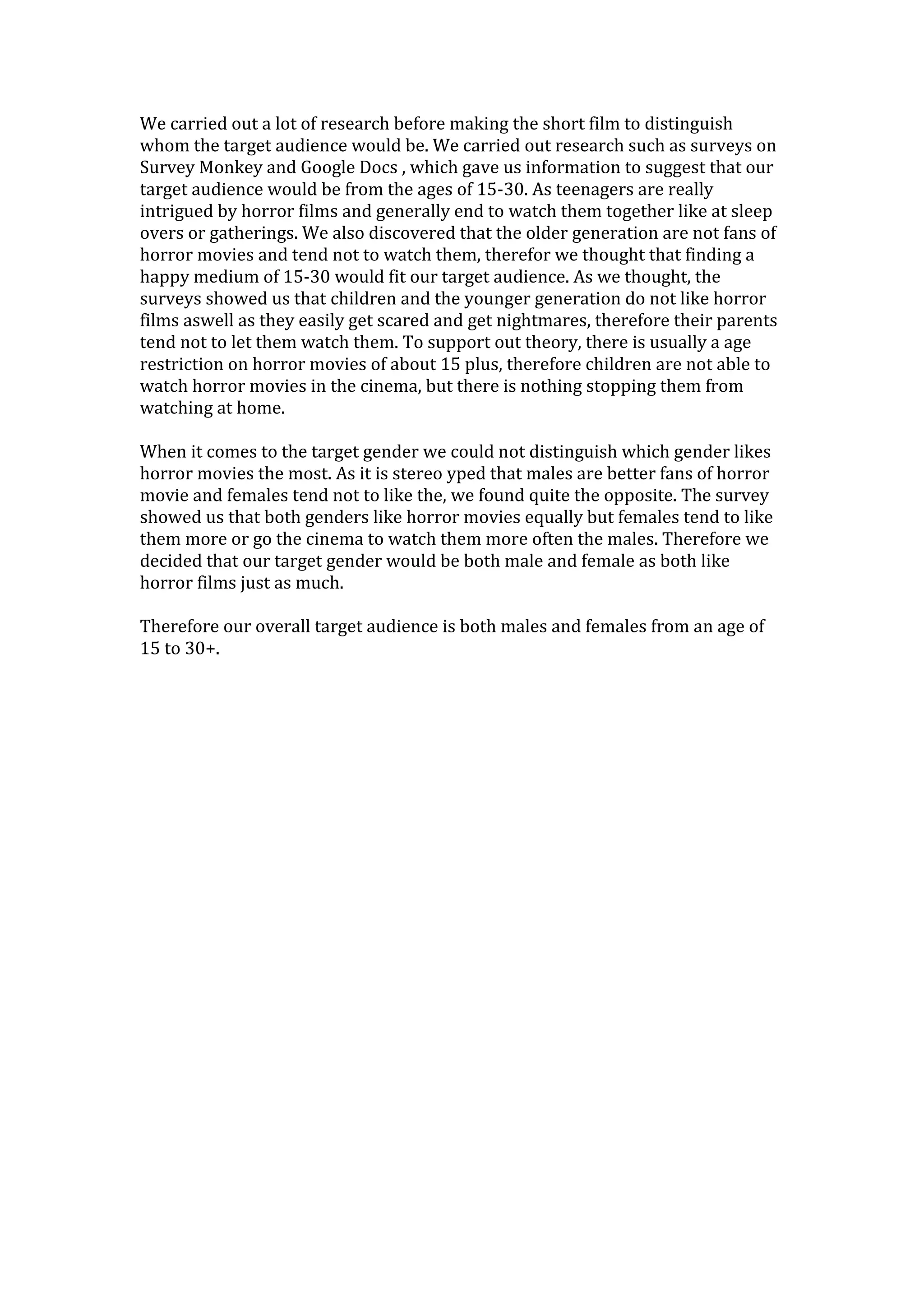 We conducted surveys to determine the target audience for our short horror film. The surveys showed that teenagers aged 15-30 and both males and females like horror films equally and would enjoy watching our film. Younger children are easily scared by horror movies, and older audiences generally dislike the genre, so our target audience is people aged 15-30 of both genders.
