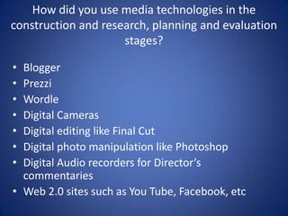 The student used a variety of media technologies throughout the construction, research, planning, and evaluation stages of their project. During research, they used Blogger to share discussion notes on music video conventions and Prezi to creatively present findings. In planning, Final Cut Pro was used to edit audition and music video footage while Photoshop created the digipack design. YouTube facilitated sharing work and collecting audience feedback, though uploading times were lengthy. Digital audio recording captured voiceovers although background noise interfered. Overall, the technologies streamlined collaboration and production, but file organization and technical issues arose at times.