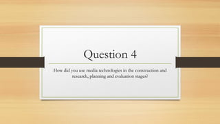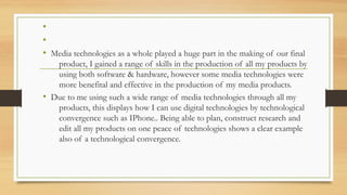Media technologies played a key role throughout the construction, research, planning and evaluation stages of the project. YouTube and Google were used extensively for research and planning to analyze existing music videos and find inspiration. A Nikon DSLR camera was used for production and Adobe Premiere was used for editing, both of which the student learned to use effectively. Blogger, SlideShare and Prezi were utilized to create presentations that were easy to navigate and visually appealing.