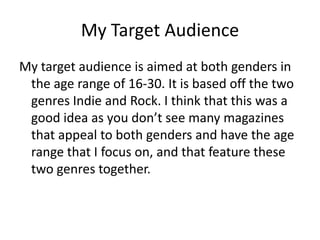 The target audience for the media product is males and females ages 16-30 who enjoy the indie and rock music genres. The document analyzes several images of people and argues they would appeal to and fit the target demographic based on their clothing styles, estimated ages, and interests in indie and/or rock music.