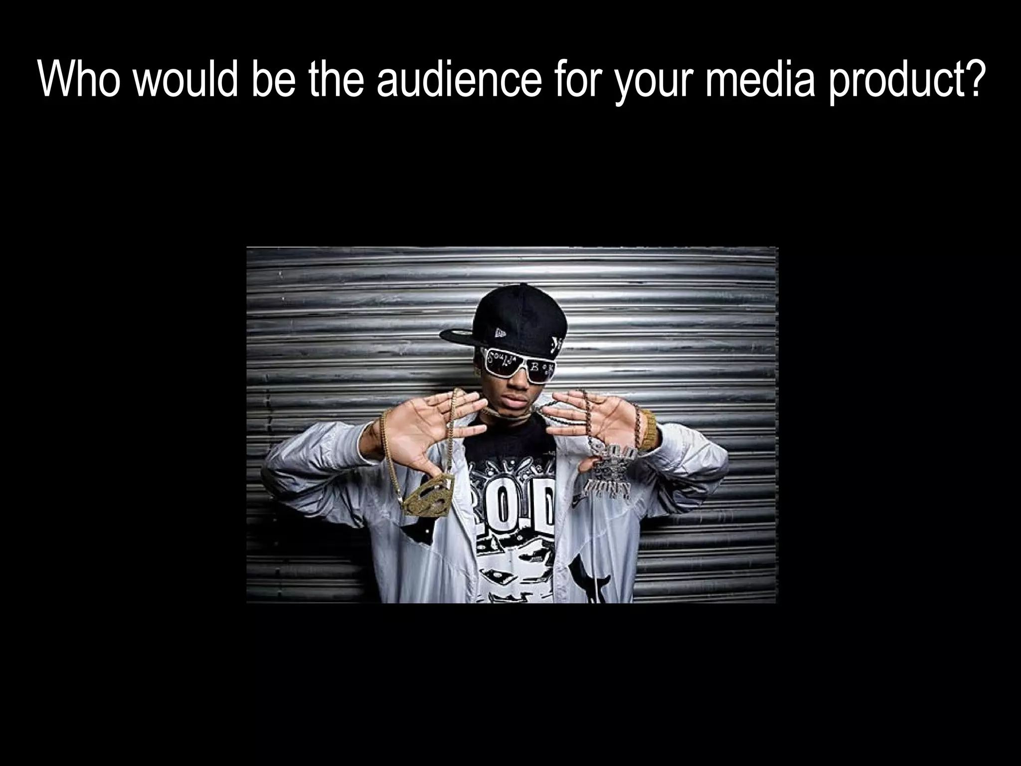 The target audience for the media product is a young black male aged 15-24 living in central London who enjoys rap music, films like "Boyz In The Hood", and displaying flashy accessories. He has ambitions of becoming a rapper or music producer.