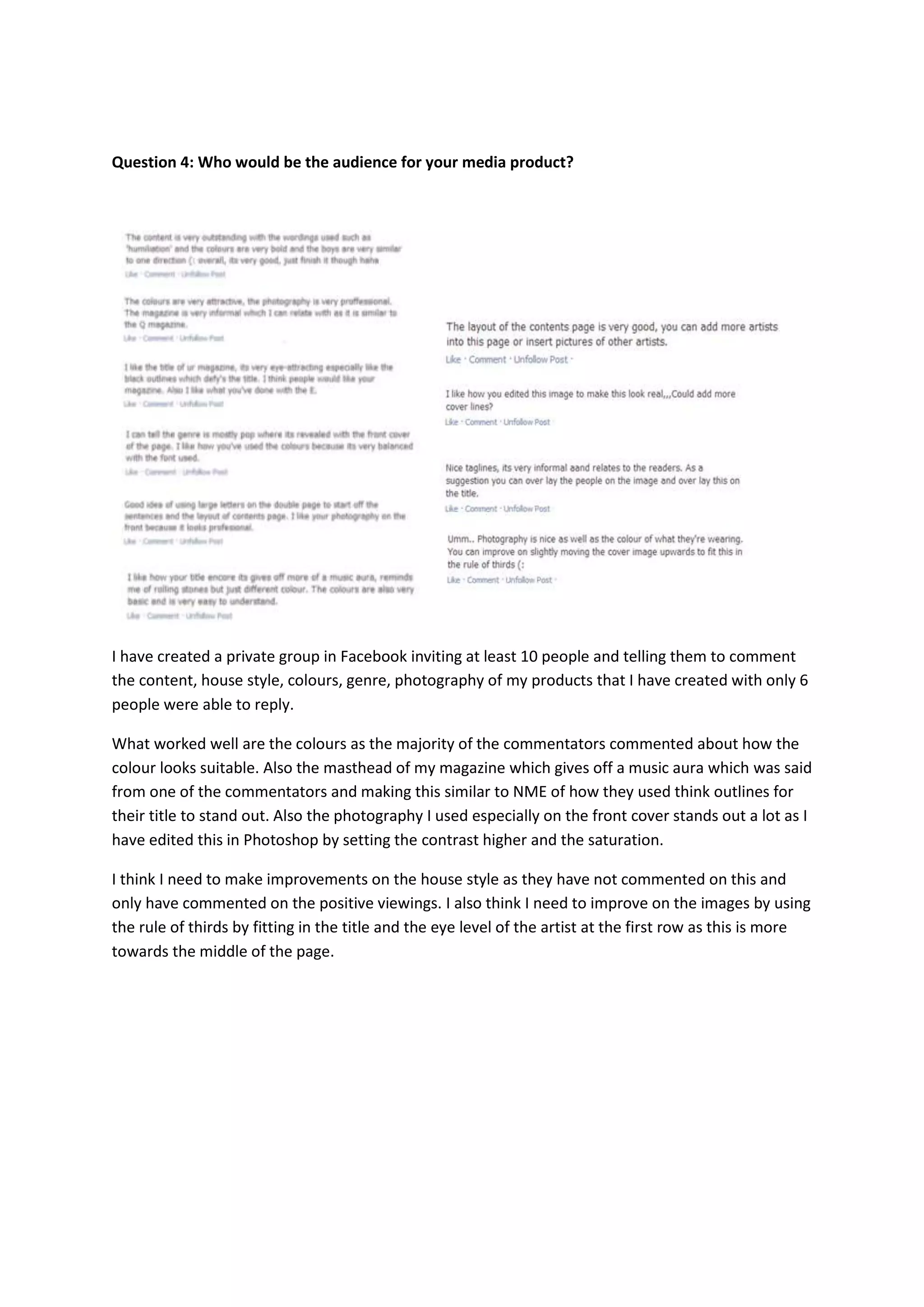 The document discusses feedback received from 10 people on a media product the author created. The feedback indicated that the colors used worked well and were suitable. The masthead design, which conveyed a music aura, was also well-received. The front cover photography stood out after being edited in Photoshop. Areas identified for improvement included the house style, which received no comments, and using the rule of thirds for image placement. The author also discusses design choices made to attract their target audience of female teenagers and above, such as featuring a boy band on the cover, using catchy cover lines, and following magazine layout conventions.