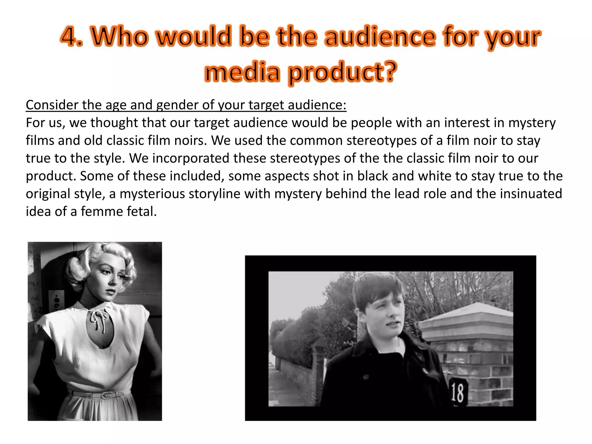 This document discusses the target audience and appeal of a student-created film noir media product. The target audience is described as people interested in mystery films and classic film noirs, with influences taken from films like Sin City. Feedback on the rough cut praised the improved music, continuity, and effective use of black and white film to denote flashbacks. Through the process, the students learned about using different camera and audio equipment and how to apply classic film noir conventions like setting and style to their modern adaptation.